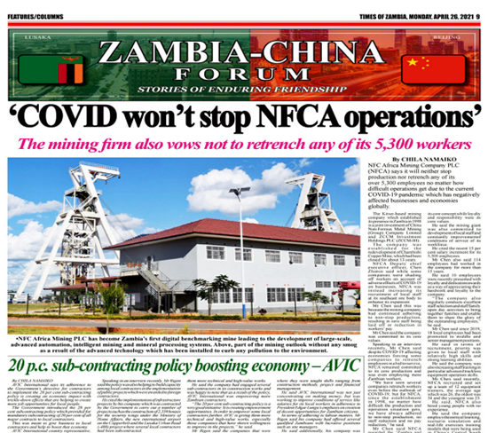 4月26日,贊比亞影響力最大的主流媒體贊比亞時報在“贊中友誼論壇”頭條位置,再次講述了中國有色集團(tuán)出資企業(yè)中色非洲礦業(yè)公司(簡稱:中色非礦)故事——“疫情下,中色非礦不會裁減任何一個贊比亞員工”。同期財稅專版,還刊載了中色非礦自成立以來累計繳納稅收達(dá)2億美元,用行動踐行“中贊合作、共同發(fā)展”理念,積極支持贊比亞經(jīng)濟(jì)發(fā)展的專題報道。