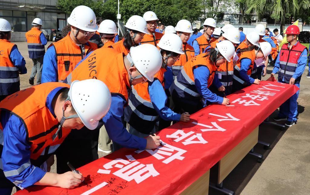 中色十五冶青年員工在“安全生產(chǎn)月”啟動儀式橫幅上進行簽名